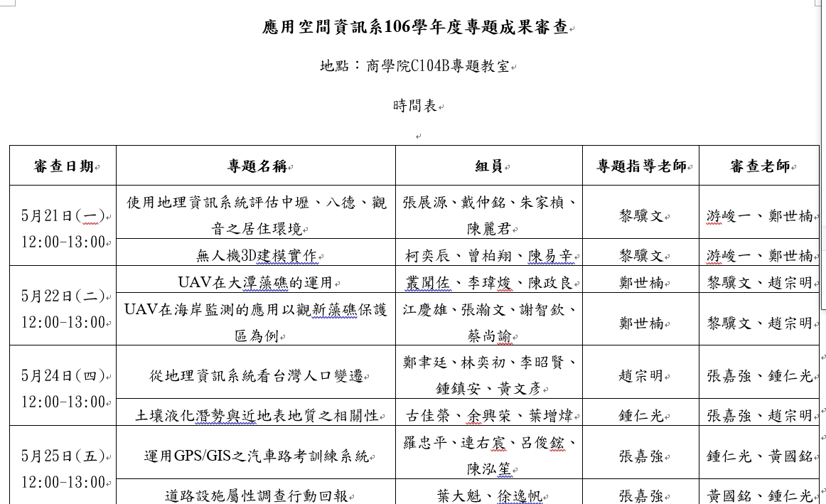 應用空間資訊系106學年度學生實務專題成果審查時間表