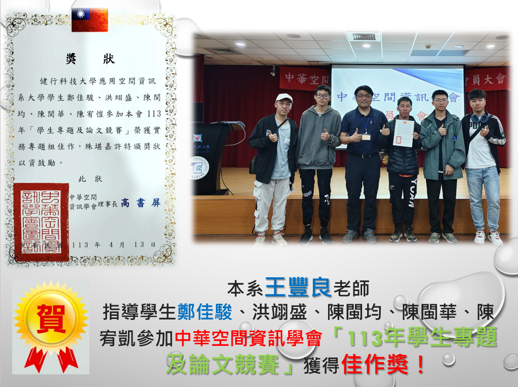 本系王豐良老師 指導學生鄭佳駿、洪翊盛、陳閩均、陳閩華、陳宥凱參加中華空間資訊學會「113年學生專題及論文競賽」獲得佳作獎
